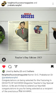 Dr.S. PRABAKARAN -"Excellent Educationist Award -2023" on National Teachers' Day celebration by Heights of Success Magazine and Spl article published on September 2023 issue. Get link Facebook X Pinterest Email Other Apps October 18, 2023 Get link Facebook X Pinterest Email Other Apps Comments